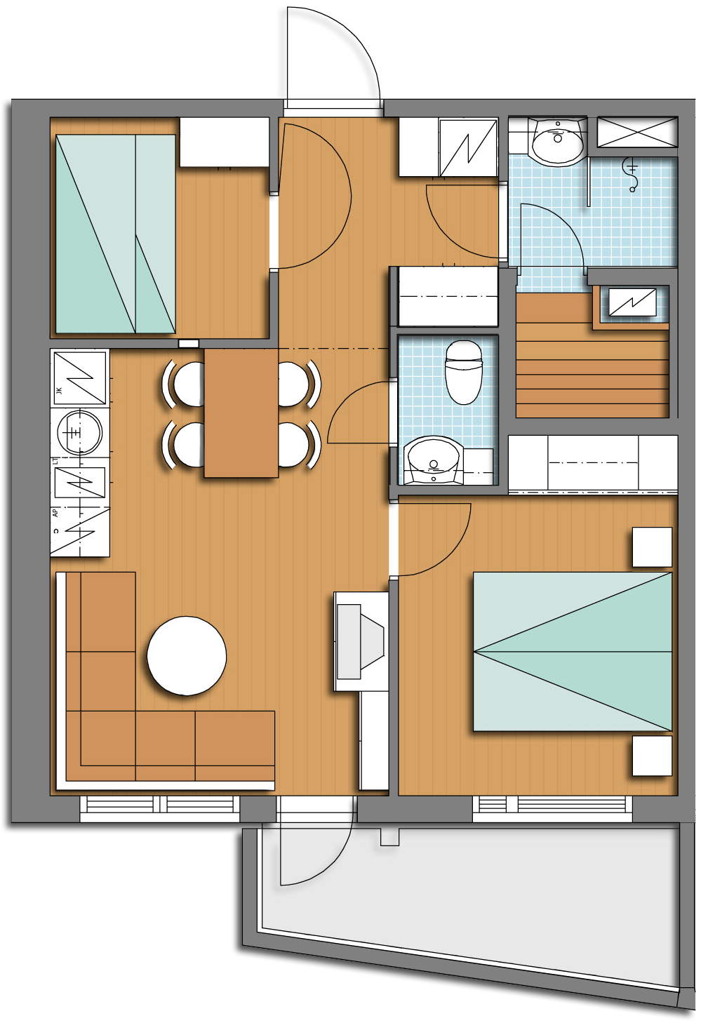 PyhäSuites43:n tilat ovat erittäin käytännöllisesti suunniteltu. Huoneistossa on makuuhuone (vuoteet 2x80cm) ja makuualkovi (kerrossänky 120cm+80cm), erillinen WC, oma sauna sekä tilava parveke. Kulmasohva mukaan lukien makuupaikkoja on 4+1/2 (kulmasohva soveltuu lisävuoteeksi 2 lapselle tai 1 aikuiselle).
